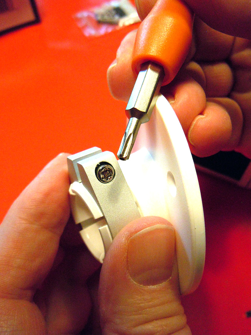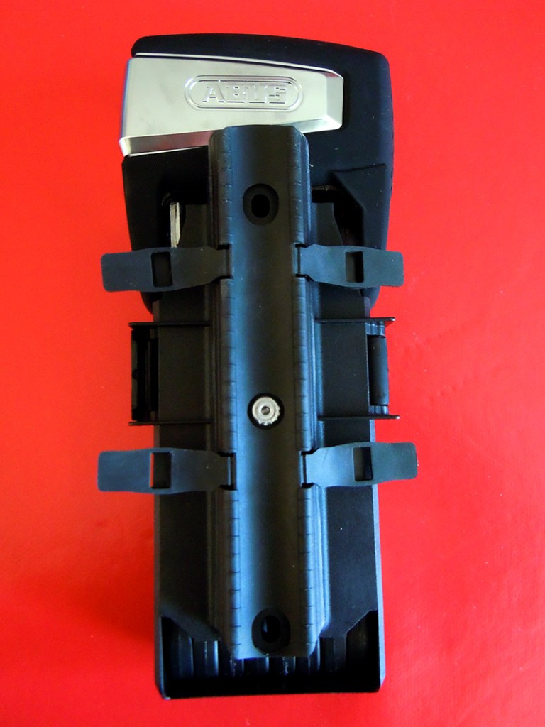 Das Schloss erscheint in seinem Industriedesign etwas futuristisch aber dennoch durch die Rundungen nicht zu hart. Modern eben. Besonders gut gefällt mir daran, dass es platzsparend zusammengefaltet und mithilfe einer Halterung am Fahrrad fest montiert werden kann. Laut Hersteller soll das Schloss am Rahmen befestigt werdenn. Wir haben uns eine andere Stelle ausgesucht: auf dem Gepäckträger direkt unterhalb des Sattels. Ich habe einen Fahrradkorb hinten drauf, der nicht ganz bis zum Ende des Gepäckträgers reicht. Diese Lücke haben wir genutzt. Die Halterung anzubringen war nicht so ganz einfach, weil wir den Korb mit Kabelbindern fixiert haben. Die Befestigungsstreifen erst durch die Laschen und dann wieder unter der Halterung hindurch zur anderen Seite zu führen gestaltete sich etwas fummelig, was aber an dem ausgesuchten Platz liegen mag. Die Bänder mit Schrauben zu fixieren ist eine gute Idee. Allerdings wäre es nicht schlecht gewesen, einen passenden Imbusschlüssel beizulegen. Nicht jeder ist so gut ausgestattet wie wir und hat eine große Auswahl an Schlüsseln.